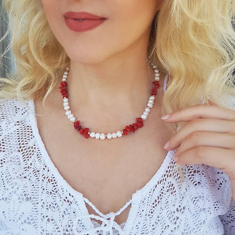 925 Ayar Gümüş İnci ve Mercan Taşlı Kolye