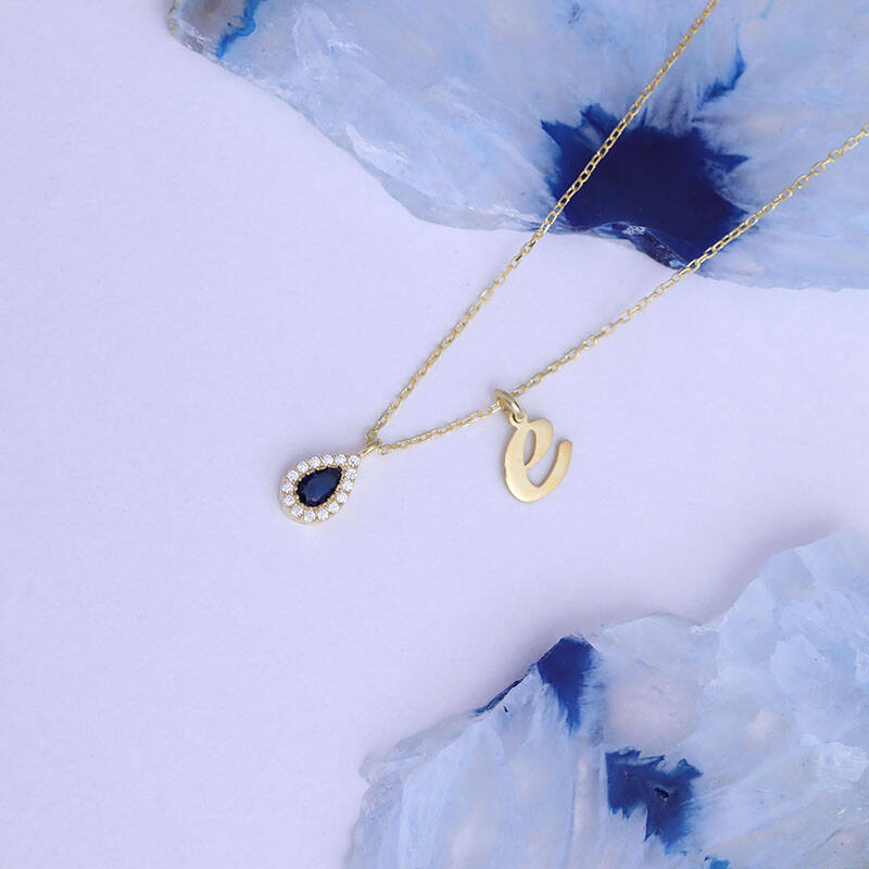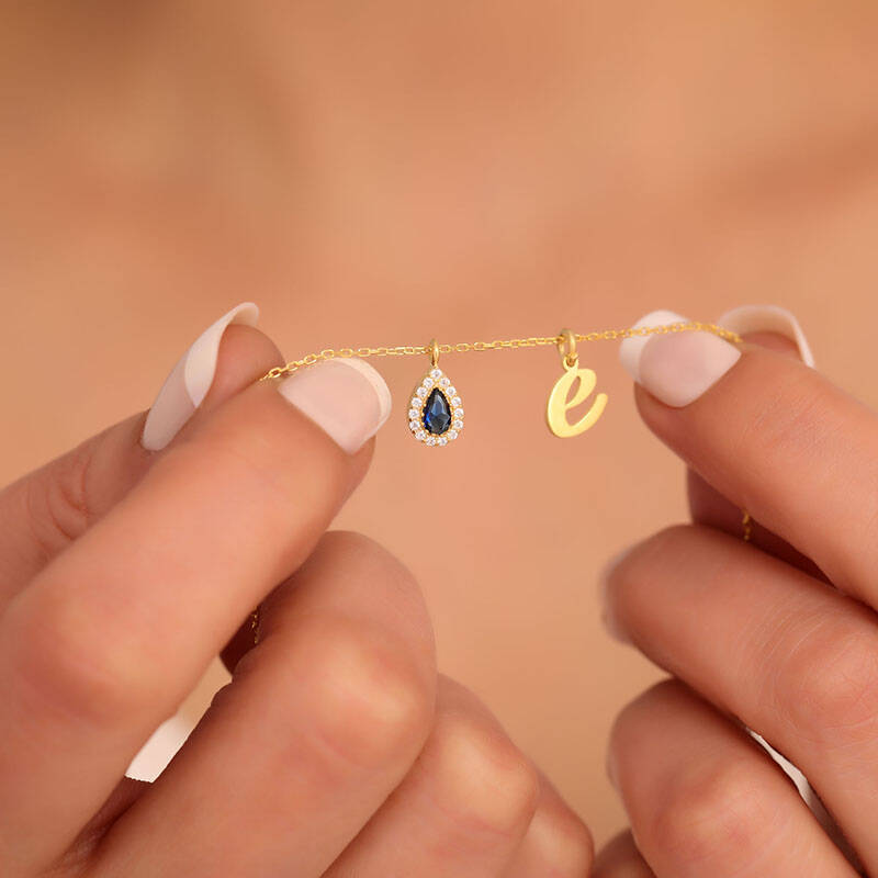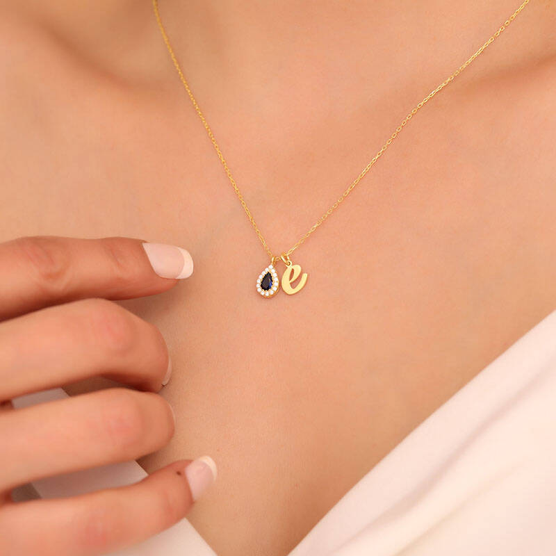 925 Ayar Gümüş Lacivert Damla Taşlı Harf Kolye
