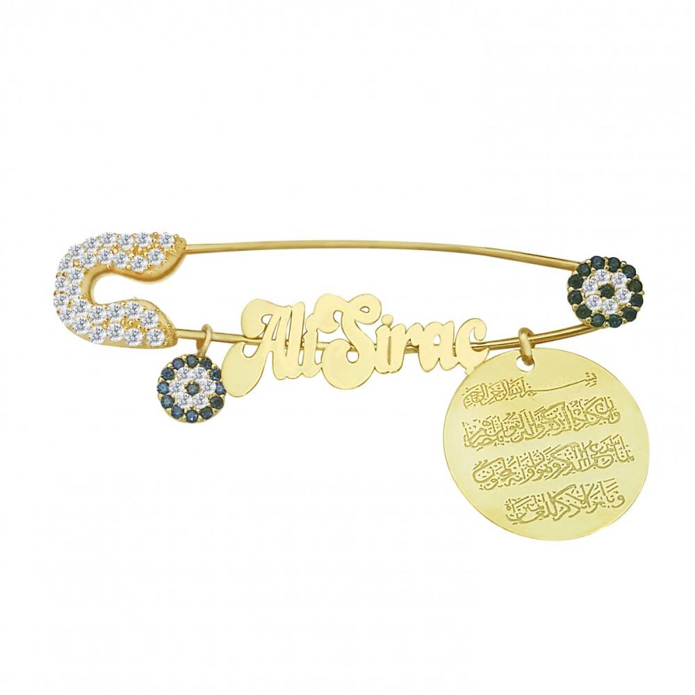 925 ayar gümüş, üzeri altın kaplama Sallantılı nazar boncuğu ve sabit nazar vardır. Nazar duası mevcuttur. Kişiye özel isim yazılır. Hediye paketi ile teslim edilir.