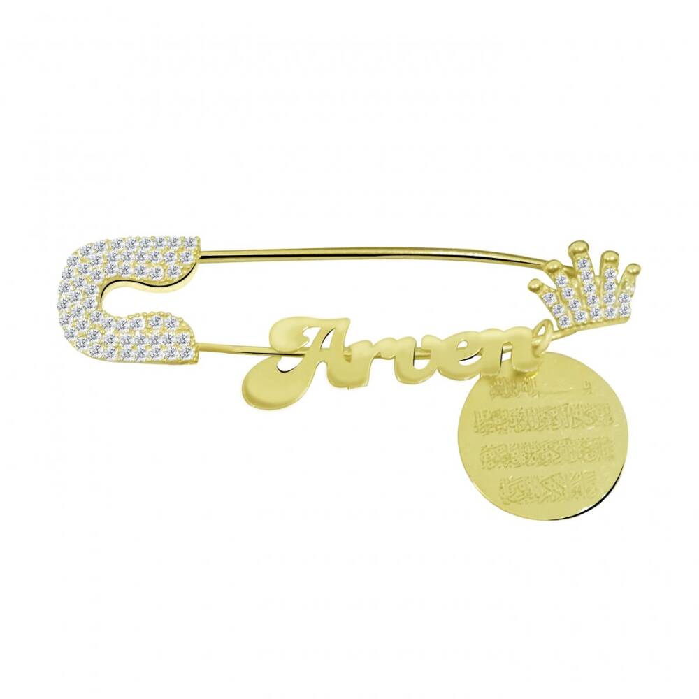925 ayar gümüş, üzeri altın kaplama Sabit taç vardır. Nazar duası mevcuttur. Kişiye özel isim yazılır. Hediye paketi ile teslim edilir.