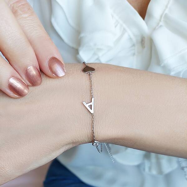 Vaoov 925 Ayar Gümüş Harf Taş ve Kalpli Bileklik