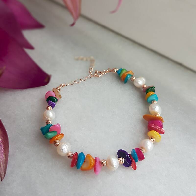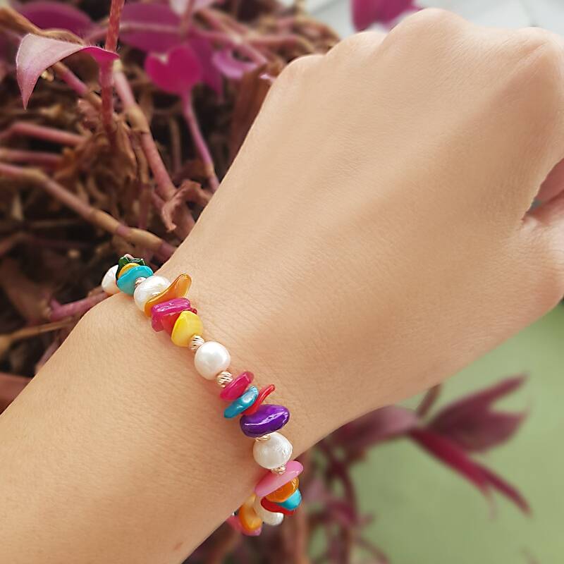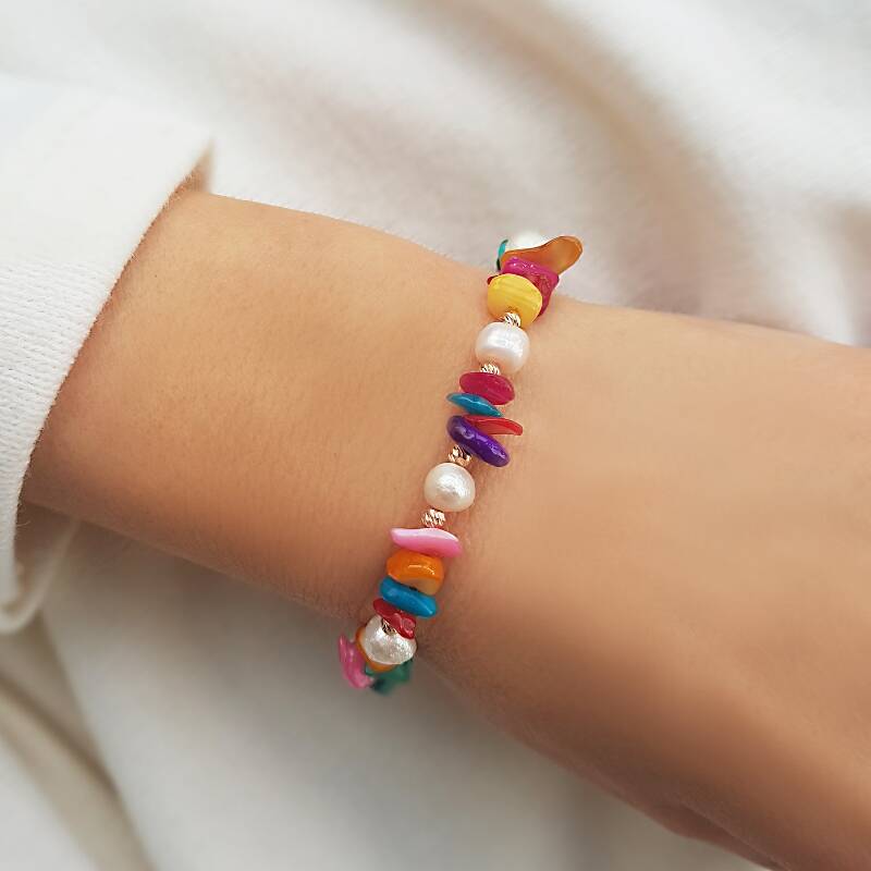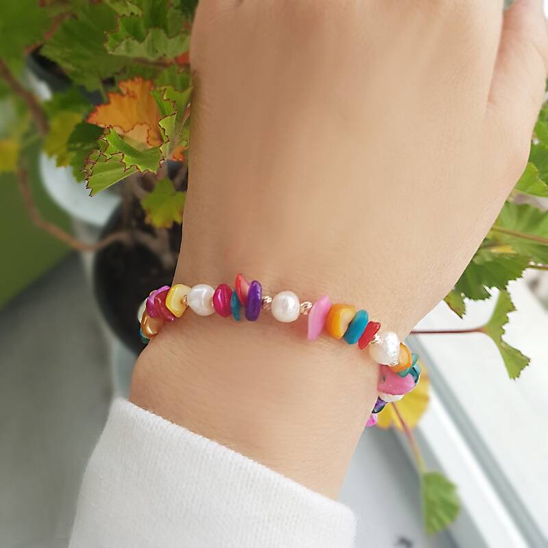 Vaoov 925 Ayar Gümüş İnci ve Renkli Sedef Taşlı Bayan Hediye Bileklik