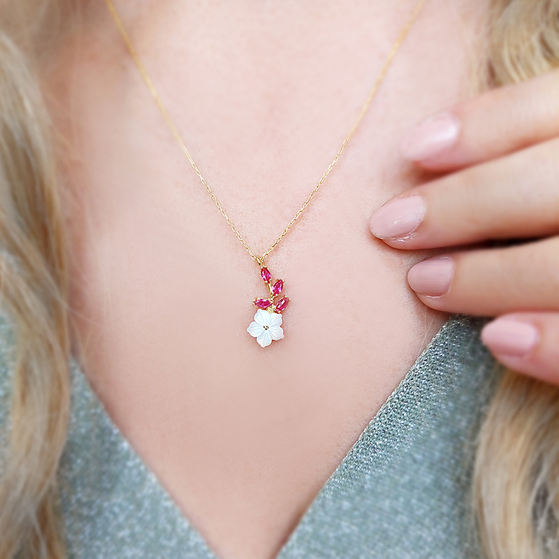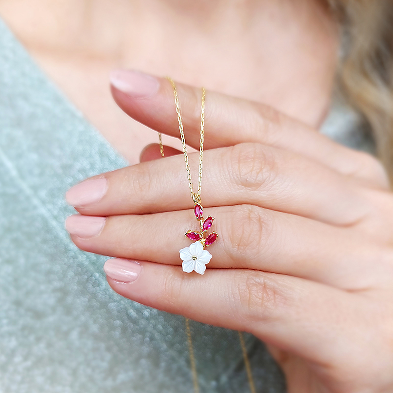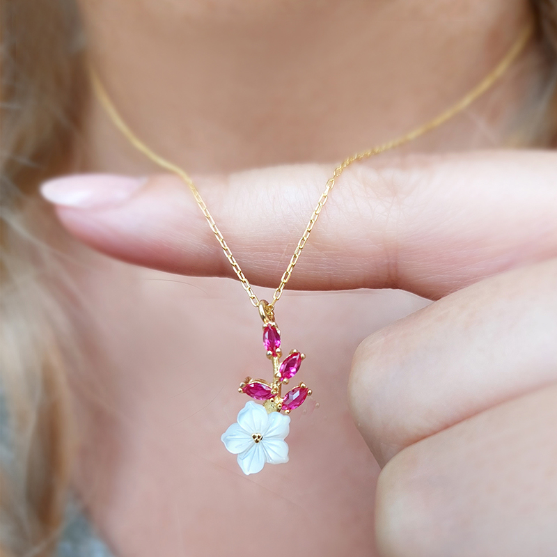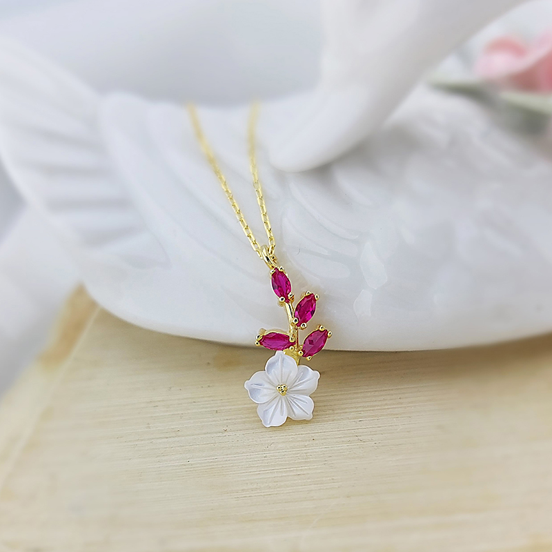 Vaoov 925 Ayar Gümüş Kırmızı Taşlı Sedef Çiçekli Kolye