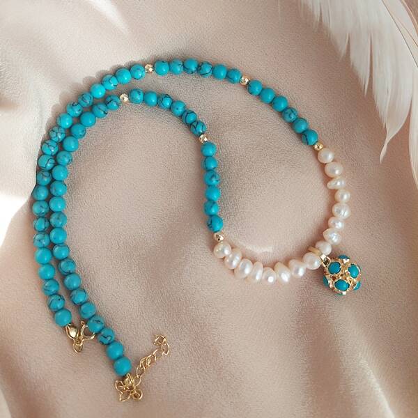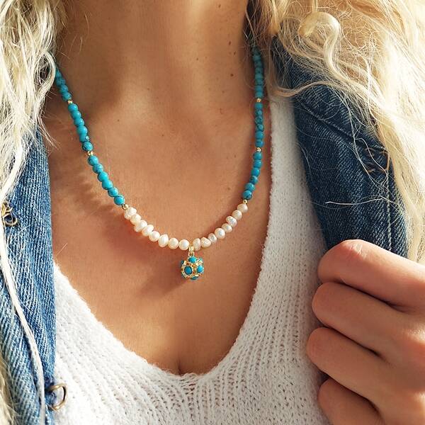 Vaoov 925 Ayar Gümüş Mavi Firuze Taşlı İnci Kolye