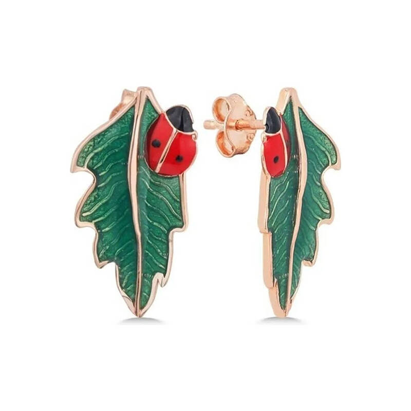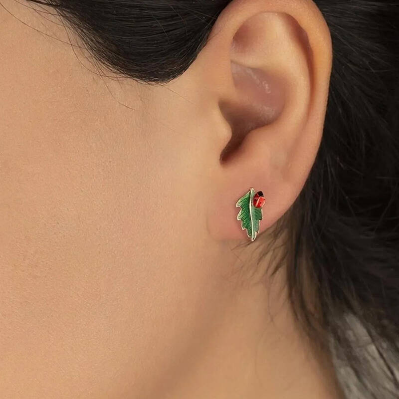Vaoov 925 Ayar Gümüş Mineli Yeşil Yaprak ve Uğurböceği Küpe
