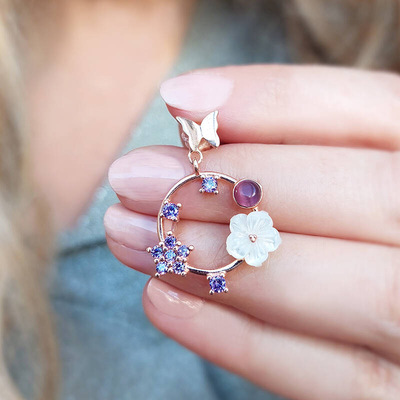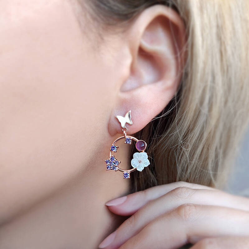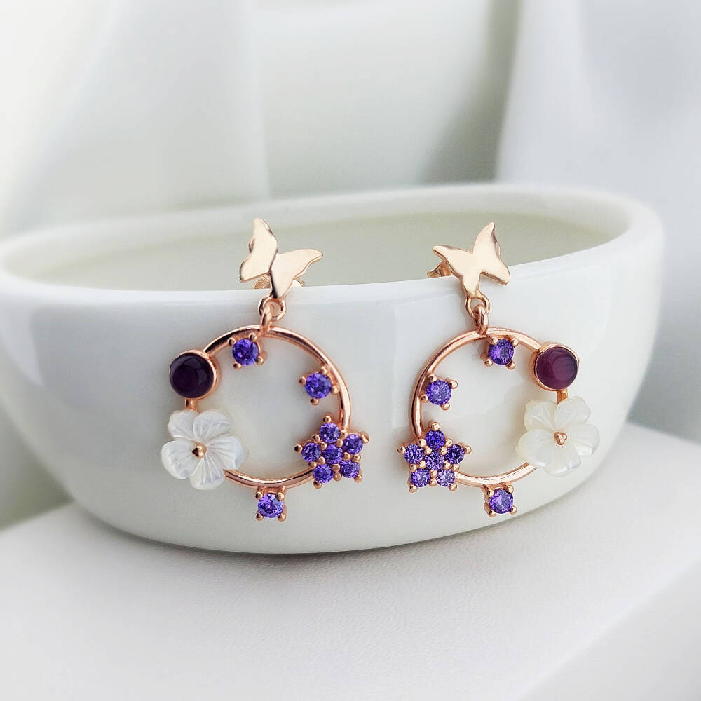 Vaoov 925 Ayar Gümüş Mor Taşlı Sedef Çiçekli Kelebek Küpe