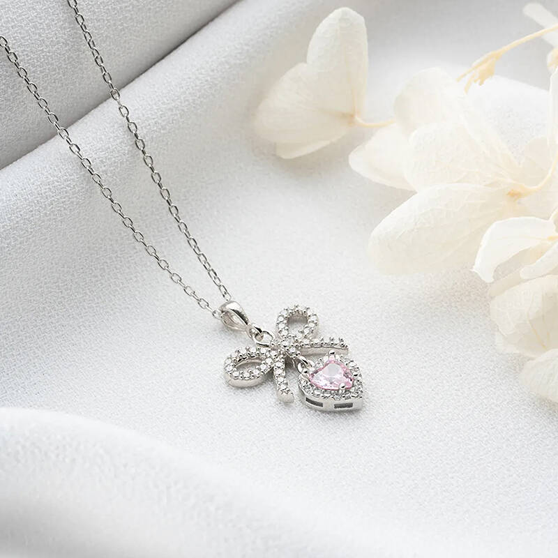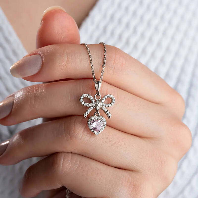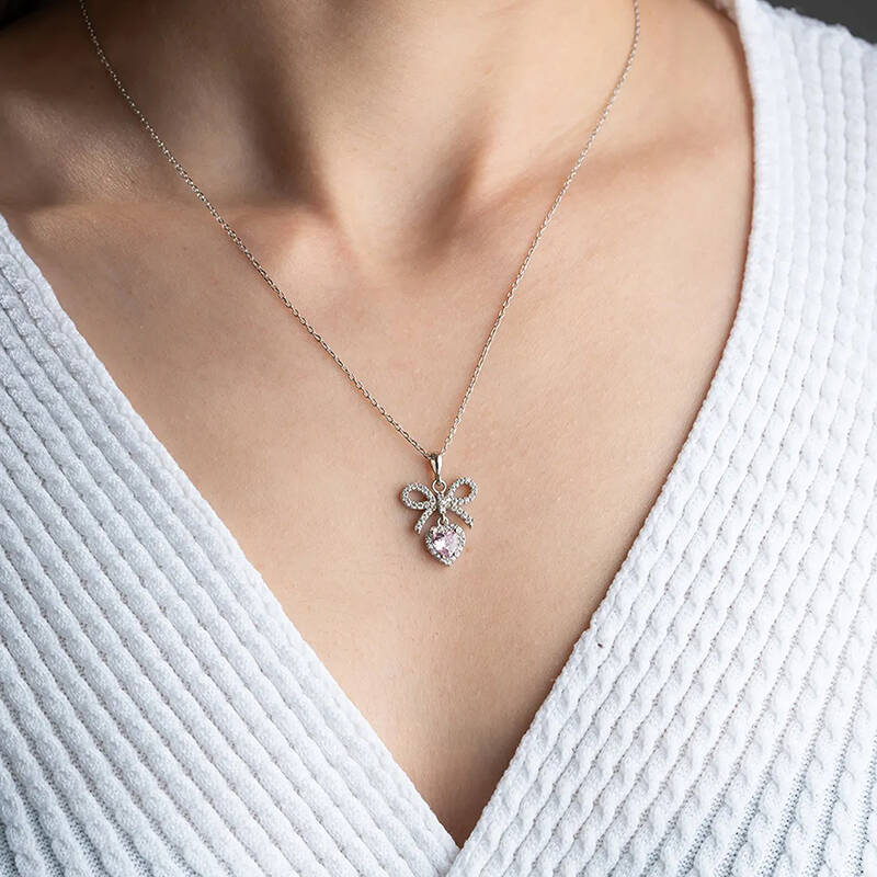 Vaoov 925 Ayar Gümüş Pembe Kalp Taşlı Kurdele Kolye