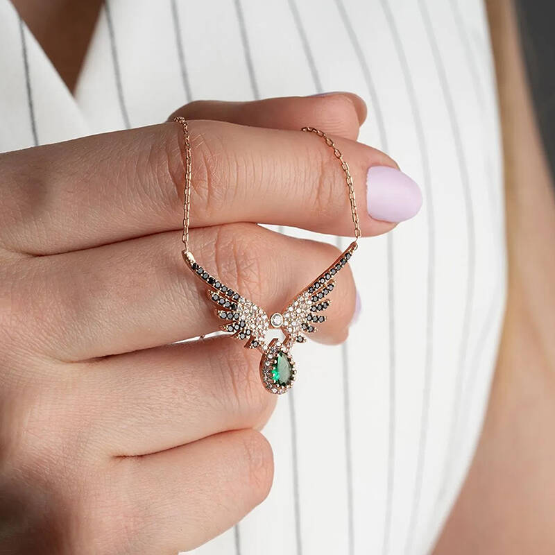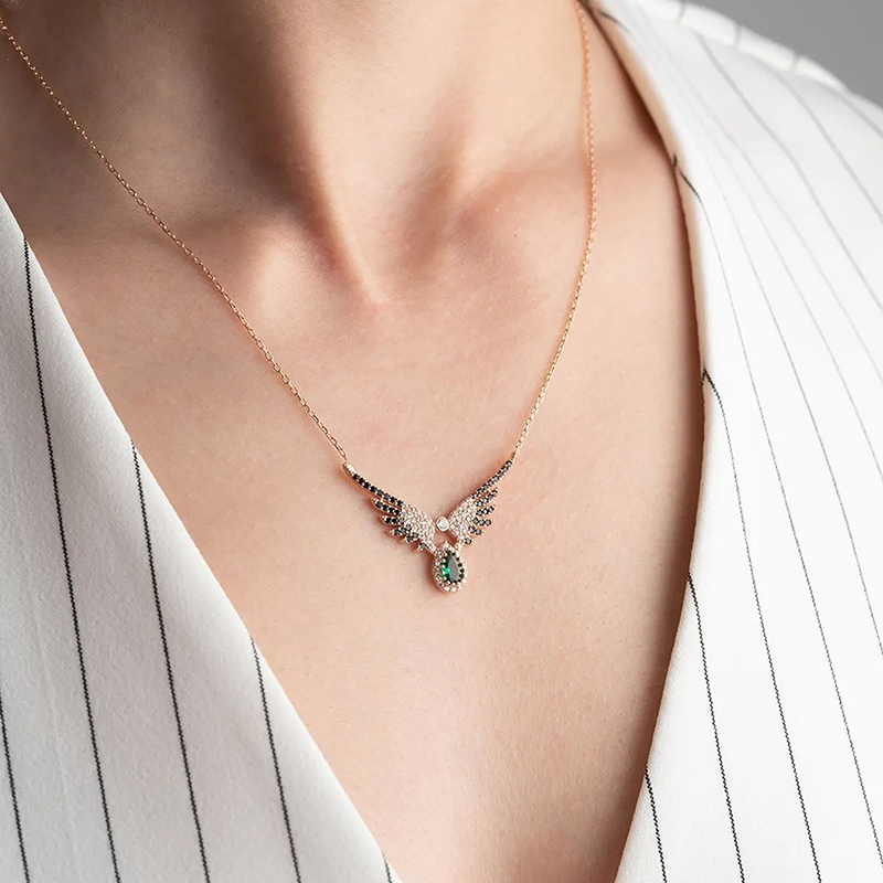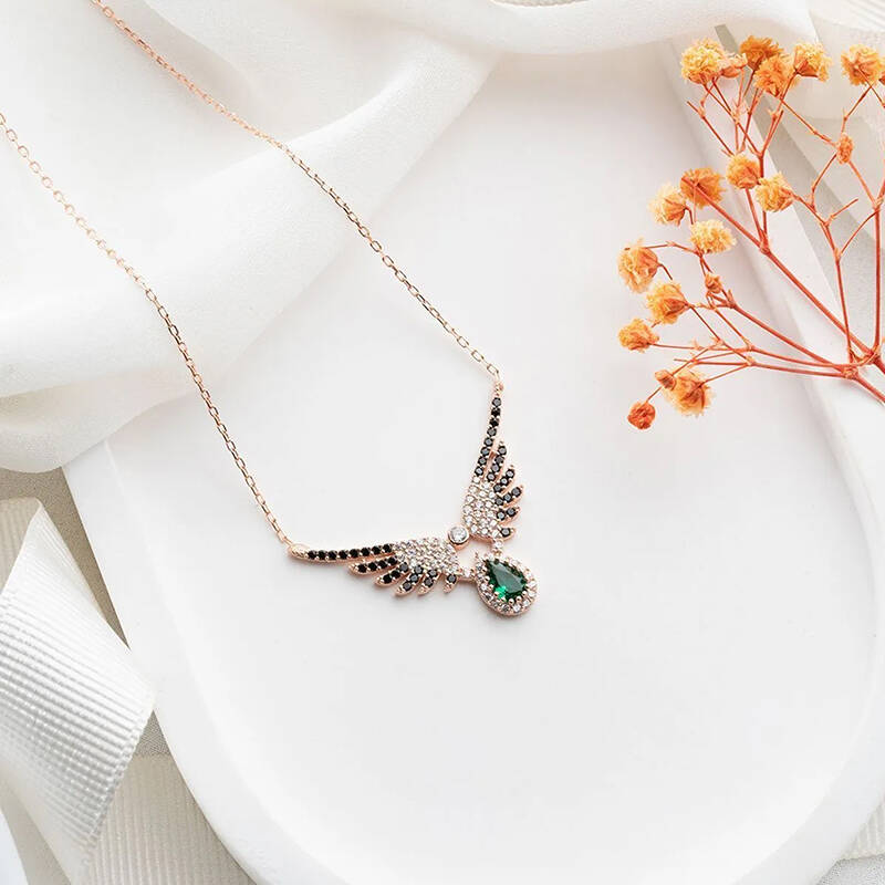 Vaoov 925 Ayar Gümüş Yeşil Damla Taşlı Melek Kanadı Kolye