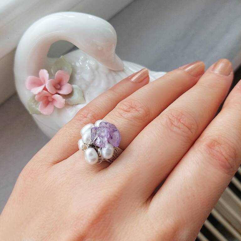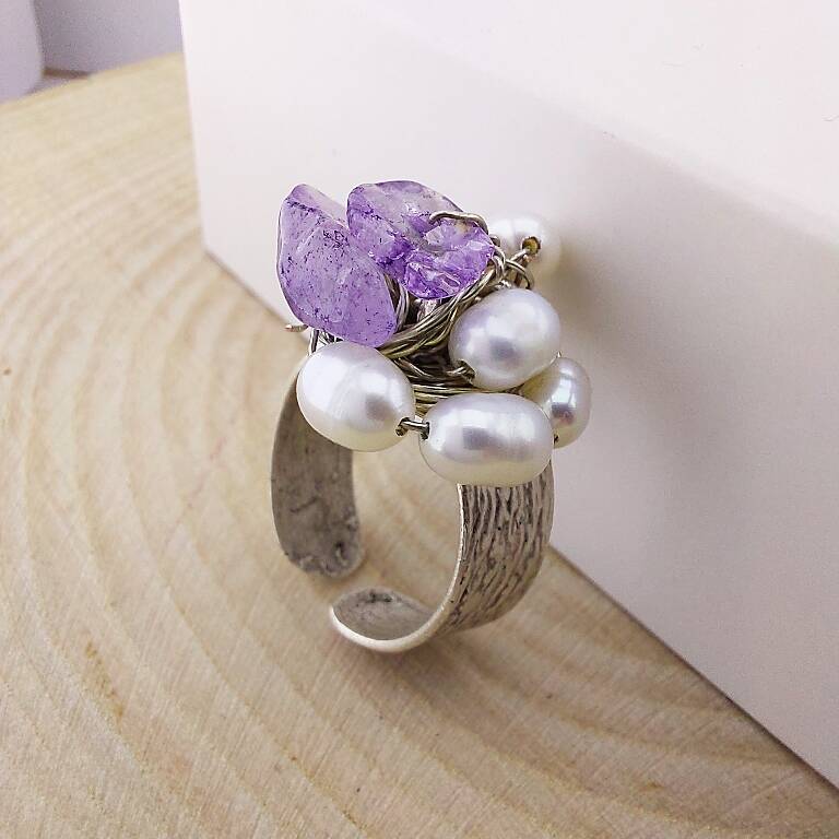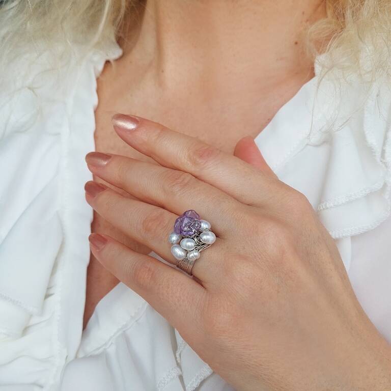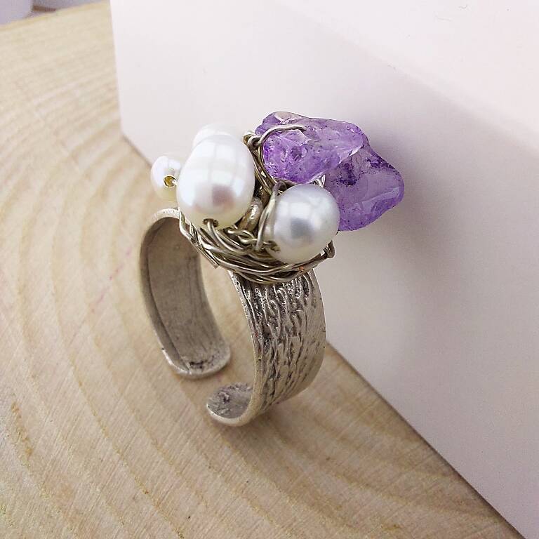Vaoov Gümüş Kaplama Ametist ve İnci Yüzük